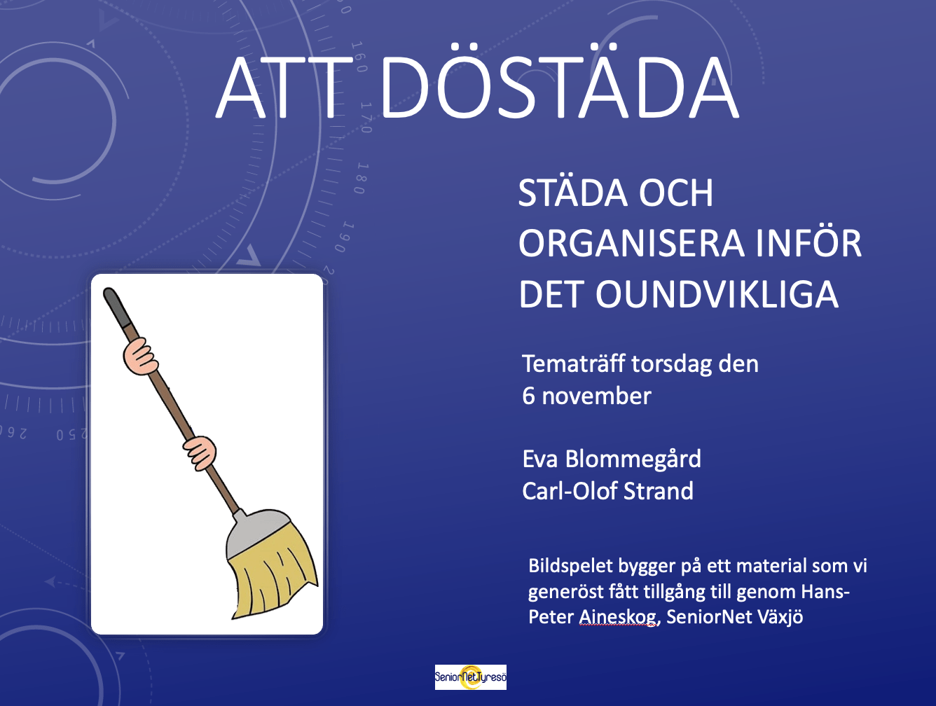 Torsdag den 6 november hölls höstens andra tematräff. Det handlade denna gång om att att DÖSTÄDA, ett för oss äldre viktigt, men samtidigt lite ”motigt” ämne. Guider i ämnet var Eva Blommegård och Carl-Olof Strand. Trots – eller kanske tack vare – ämnets svåra karaktär kom hela 80 personer till vår lokal Nyfors i föreningsgården Kvarnhjulet för att höra om hur vi kan förbereda vår egen bortgång och därmed göra våra efterlevande en stor tjänst.